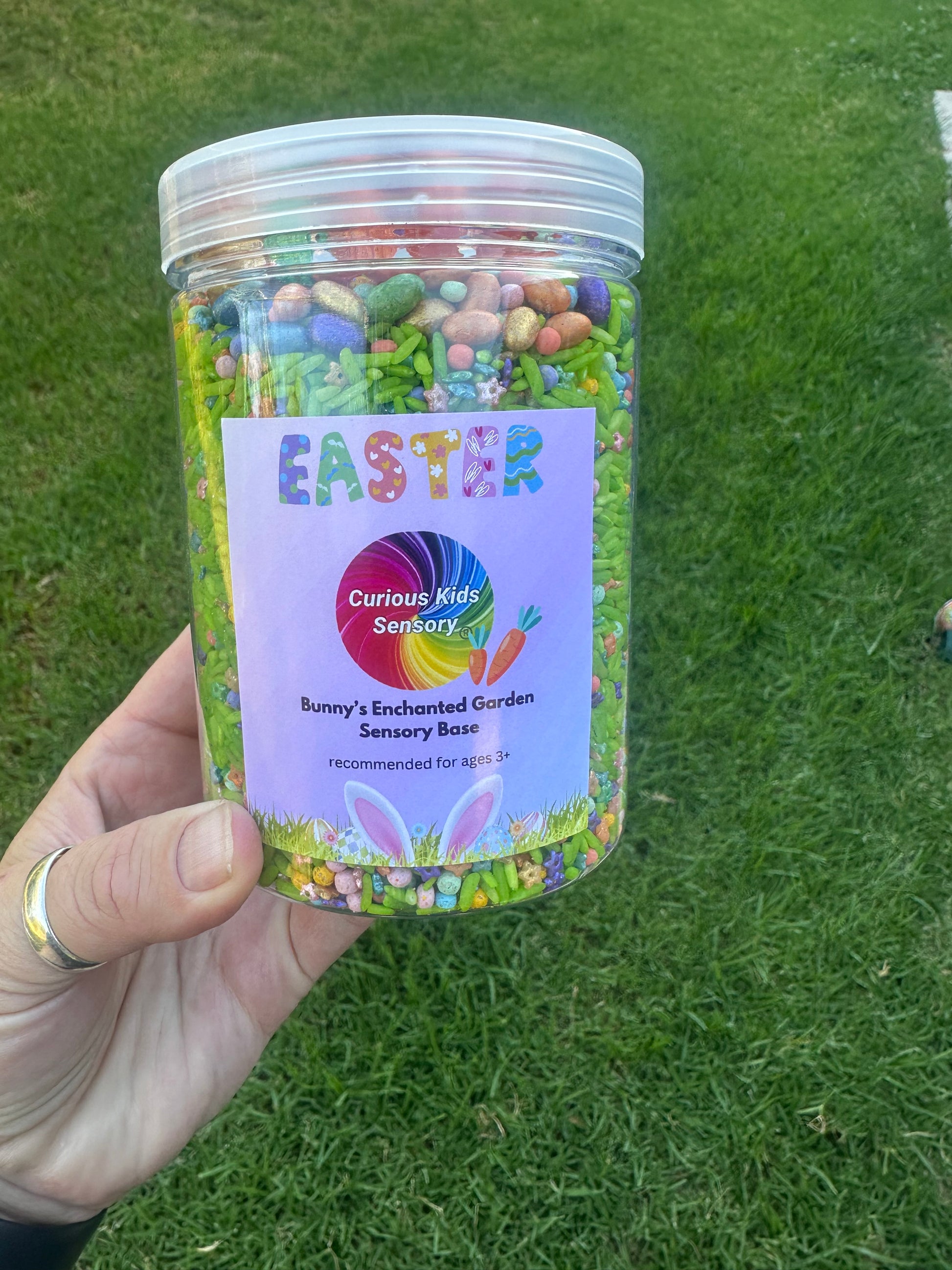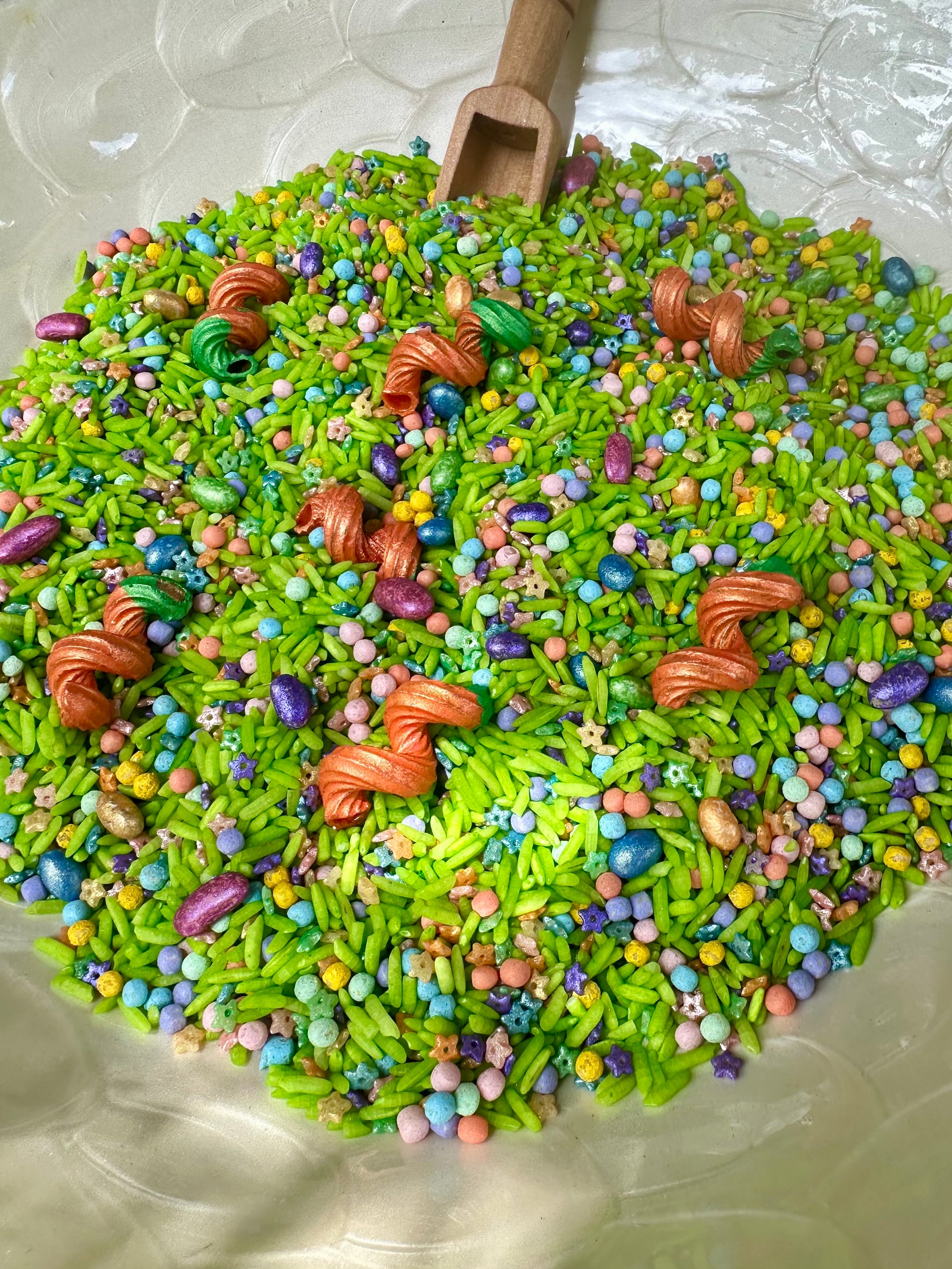 Step into a world of magic and wonder with Bunny’s Enchanted Garden sensory base. This vibrant mix is bursting with lush green rice, representing fresh spring grass, and sprinkled with colourful pebbles and sparkles to mimic a whimsical garden in full bloom. Hidden among the greenery, you’ll find charming little treasures like metallic eggs and shimmering flowers, perfect for little hands to discover and explore. The curly carrots add a playful touch, inviting imaginative storytelling and sensory adventures.