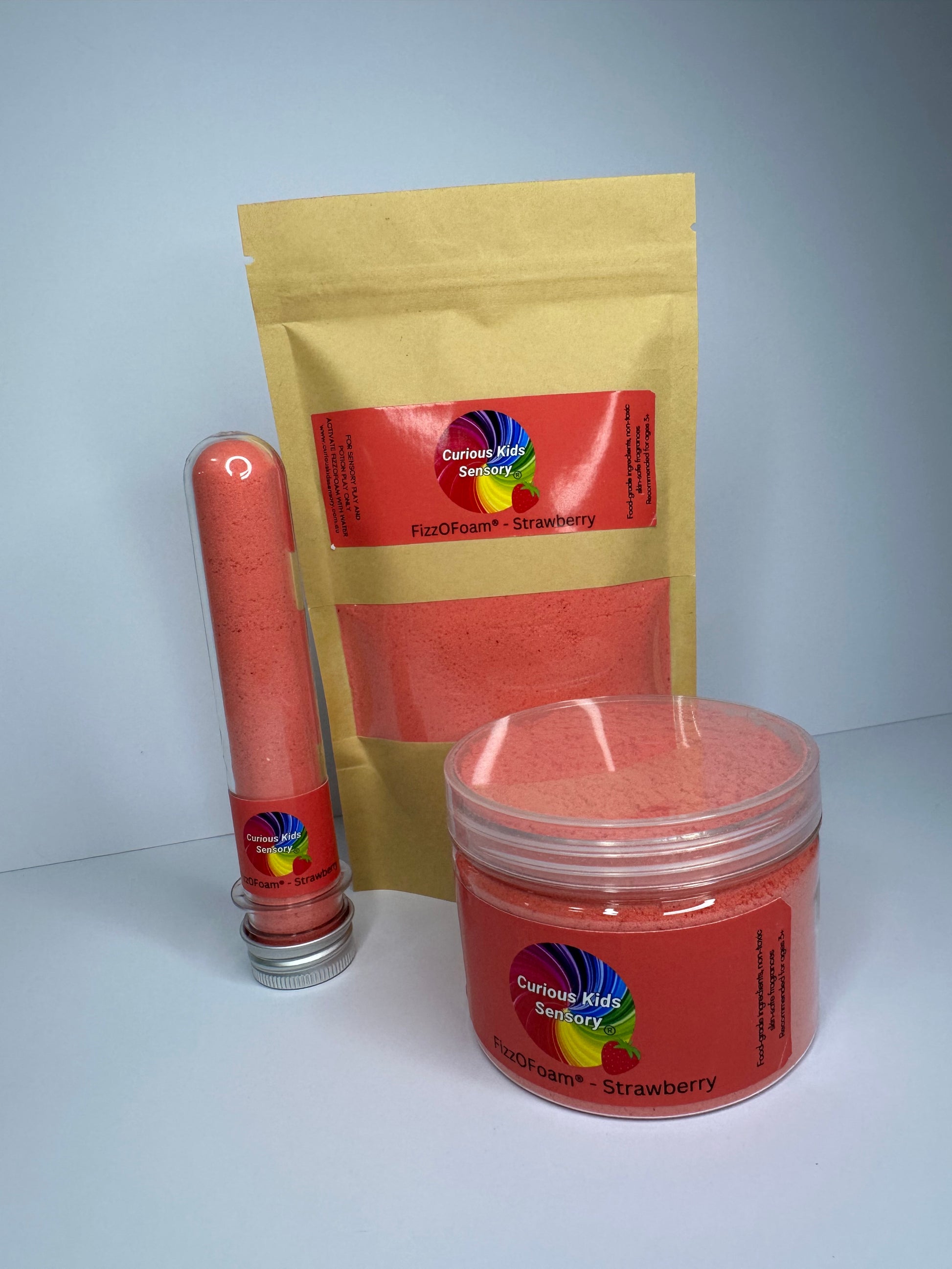 Ingredients: FizzOFoam is carefully crafted using food-grade, non-toxic ingredients, including bicarbonate soda, citric acid, corn starch, washable colourants, mica powder, sodium coco sulfate, and skin-safe fragrance oil. These ingredients create a fun, sensory fizzing and foaming experience.